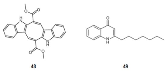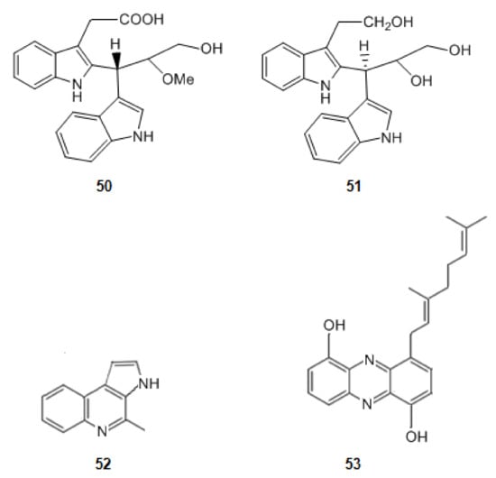 2-{2-[(1R)-3-Hydroxy-1-(1H-indol-3-yl)-2-methoxypropyl]-1H-indol-3-yl}acetic acid (50) and (3S)-3-[3-(2-hydroxyethyl)-1H-indol-2-yl]-3-(1H-indol-3-yl)propane-1,2-diol (51) (Figure 8) were isolated from a marine actinomycetes species, Rubrobacter radiotolerans []. They have a scaffold characterized by a dimeric indole nucleus. These alkaloids are moderately active as cholinesterase inhibitors. Indeed, nevertheless these molecules have two planar regions constituted by the two indole rings, they have not a corresponding extended aromatic system as, between them, there is a sp3 carbon, suggesting that the interaction between the esterase and the second indole group hinders the interaction of the active site of AChE and the first indole group.