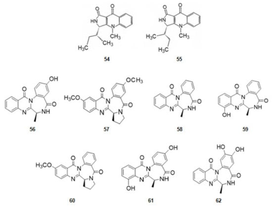 From the fungus Aspergillusochraceus, associated with corals, a series of several alkaloids with a quinazoline benzodiazepine scaffold, the circumdantins (Figure 9), derivatives of anthranilic acid, were extracted. Circumdantin C (56), D (57), F (58), G (59), H (60), I (61), and 2-hydroxycircumdantin C (62) were isolated. Circumdantin D (57) exhibited high inhibitory effect toward AChE and interference with pro-inflammatory response [].