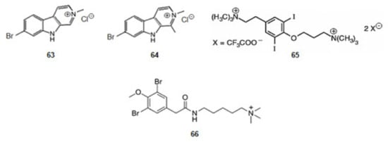 Sponges of the Latrunculia genus, dredged from the Antarctic Ocean, contained four discorhabdin alkaloids (Figure 11) []. From Latrunculia biformis (+)-discorhabdin G (67) [] and (−)-3-dihydro-7,8-dehydrodiscorhabdin C (68) [] were extracted whilst from Latrunculia bocagei (+)-discorhabdin B (69) [] and (−)-discorhabdin L (70) [] were isolated. (+)-Discorhabdin B (69) shows a higher activity against human recombinant AChE (hAChE) [] suggesting that its three relevant H-bonds, in addition to a series of hydrophobic interactions due to the presence of the bromine and sulfur atoms.