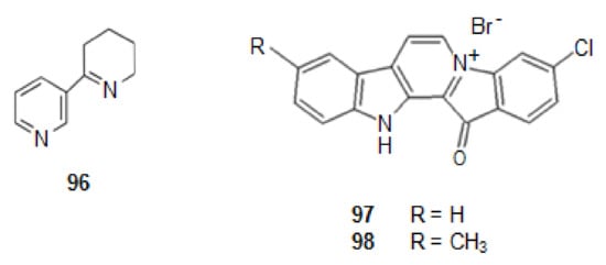 Petrosamine (73) (Figure 11), collected in Thailand, was extracted from a sponge of the genus Petrosia []. This alkaloid is a derivative from two amino acids, tryptophan and tyrosine. Petrosamine (73) shows strong AChE inhibitory activity. The most important interaction between petrosamine-AChE is due to the quaternary ammonium group of the alkaloid.