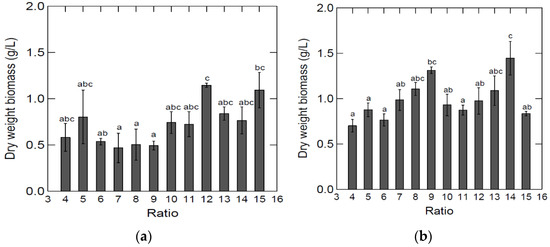 Average dry weight biomass using different lung (a) and spleen (b) to H2O ratios (grown at 25 °C for 7 days) in medium containing 2.18 (±0.25) g/L (lung BYPP) and 2.48 (±0.30) g/L (spleen BYPP). Sample size was n = 3 for each ratio. Standard deviation is shown in error bars. ANOVA test (p = 0.00194). The letters show statistically significant differences (p < 0.05, Tukey’s test) between measurements, where “a” shows the lowest value and “c” the highest.