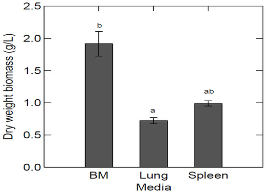 The average dry weight biomass in different media. The highest dry weight biomass in BYPP media was selected, lung:H2O ratio—1:12 and spleen:H2O ratio—1:14, and are compared to dry weight biomass in glycerol BM. Sample size is three for all media. Standard deviation is shown in error bars. ANOVA test (p = 0.00926). The letters show statistically significant differences (p < 0.05, Tukey’s test) between measurements, where “a” shows the lowest value and “b” the highest.