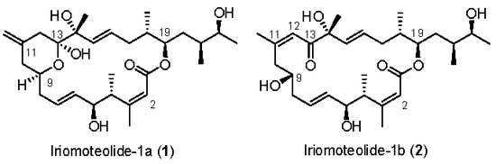 Proposed structures of iriomoteolide-1a (1) and -1b (2).