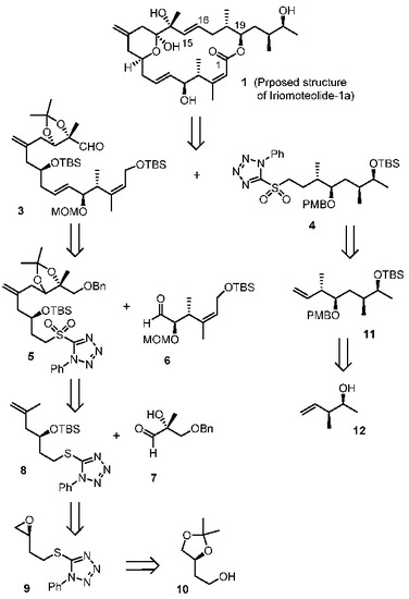 Marine natural products are a great source of structurally intriguing bioactive molecules with novel modes of action [1,2]. The field of marine natural products is immensely important in modern drug discovery. Already, many new approved drugs with interesting biological mechanisms are in pharmacies [3,4]. The field has great potential in modern medicine; however, it is vastly unexplored. The synthesis of these bioactive molecules and exploration of structure activity relationship studies are playing an important role in drug discovery today [5,6]. Iriomoteolide-1a (1) (Figure 1) is a 20-memembered cytotoxic macrolide, which was isolated by Tsuda and co-workers from a benthic HYA024 strain of dinoflagellate Amphidinium sp. collected off Iriomote Island, Japan in 2007 [7,8]. It displayed very potent cytotoxicity against human B lymphocyte DG-75 cells, with an IC50 value of 2 ng/mL. Furthermore, it exhibited cytotoxicity against Epstein–Barr virus (EBV)-infected human lymphocyte Raji cells (IC50 = 3 ng/mL) [7,8]. The initial structure of iriomoteolide-1a (1) was determined based on extensive 2D-NMR studies and mass spectroscopic analyses. The relative and absolute configurations were assigned based on the NMR studies, conformational analyses of derivatives of 1 with Mosher’s reagent. Later, Tsuda et al. reported the isolation of iriomoteolide-1b (2) [8], which was isolated from the same HY A024 strain of dinoflagellate Amphidinium sp. Iriomoteolide-1b (2) is structurally related to iriomoteolide-1a (1). Instead of a 6-membered hemiketal ring at the C9–C13 position and an exo-methylene group at C11 in iriomoteolide-1a (1), iriomoteolide-1b (2) possesses a ketone at C13 conjugated with a Z-double bond at C11–C12 and a hydroxyl group at C9. Treatment of iromoteolide-1a (1) with triethylamine in dichloromethane for 168 h furnished a polar product. The 1H NMR analyses reveal that the product is identical to iriomoteolide-1b (2). However, the IC50 value of 2 against DG-75 cells is found to be less potent than that of 1 (IC50 900 ng/mL) [7,8]. Iriomoteolides targets have attracted considerable synthetic interest, leading to the syntheses of various segments of iriomoteolides [9,10,11,12,13,14,15,16,17]. In addition, synthesis of the proposed structures of iriomoteolides, as well as syntheses of structural variants of iriomoteolides, have been reported [18,19,20,21,22,23]. Thus far, neither the biological mechanism of action nor the correct structures of iriomotelides have been reported. Herein, we report our revised syntheses of the proposed structures of iriomoteolide-1a and -1b. Our convergent and highly stereoselective synthetic route was utilized for the syntheses of three rationally designed structural variants for structural elucidation and biological studies.