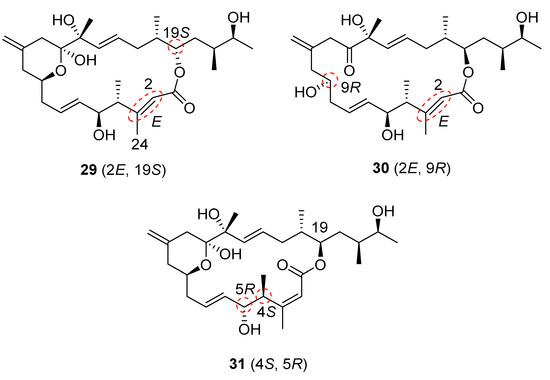Although the 1H NMR and 13C NMR spectral data of our synthetic iriomoteolide-1a (1) are comparable to those of independent work reported from other groups [18,20], neither data of 1 nor data of 2 matched those of natural iriomoteolide-1a and -1b (Please see Supplementary Materials for NMR comparison). This suggested that the structures of both natural iriomoteolide-1a and iriomoteolide-1b have been assigned incorrectly. While there are many minor differences, the major discrepancies involve the 1H and 13C shifts at C4 (3.98 ppm and 40.6 ppm, respectively, for synthetic iriomoteolide-1a compared to 2.46 ppm and 47.9 ppm, respectively, for the natural product). In addition, there is a distinction of chemical shifts at C24 (1.96 and 20.8 ppm, respectively, for synthetic 1 compared to 2.12 and 23.8 ppm, respectively, for natural 1). These discrepancies reveal that the α,β-unsaturated double bond configuration might be E instead of Z. In addition, the structure may be an epimer at the C4 and C5 positions. Based on the NMR analysis, three diastereomers, 29, 30 and 31 (Figure 3), were designed. The syntheses of these structural variants were carried out utilizing our convergent synthetic route.