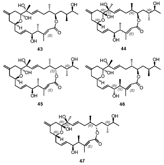 NMR spectra analysis of these diastereomers revealed that some individual chemical shifts, such as H4 and H24 of 29, H19 and H26 of 31, came closer to those of the natural product. These observations suggest that there may be an E-enoate and/or C4 and C5-epimers in the natural product. However, none of these isomers match the natural product. We carried out biological evaluations of the synthetic iriomoteolide-1a (1), -1b (2) and structural variants 29, 30, and 31. However, none of these compounds show any appreciable cytotoxicity. Yang and Dai’s research groups also reported their independent synthetic approach of several other diastereomers, such as 43 [20,22], 44 [20], 45 [20], 46 [22] and 47 [20], as shown in Figure 4. Unfortunately, none of these structures match that of natural iriomoteolide-1a. The real structure of this biologically potent natural product remains veiled, waiting for collective effort in the synthetic community.