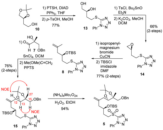 The synthesis of C7–C15 fragment 5 was planned by using a diastereoselective ene reaction [27,28], as outlined in Scheme 1. Treatment of the known alcohol 10 with 1-phenyl-1H-tetrazole-5-thiol under Mitsunobu’s condition [29] afforded the corresponding sulfide. Deprotection of the acetonide group gave the diol 13. Tosylation of diol 13 in the presence of triethylamine and dibutyltin oxide, followed by treatment of potassium carbonate in a mixture of methanol and dichloromethane, furnished the epoxide 14. Reaction of epoxide 14 with isopropenylmagnesium bromide in the presence of a catalytic amount of copper(I) cyanide resulted in the corresponding alcohol. Interestingly, Curran and co-workers reported that the reaction of the enantiomer of 14 with an alkynyllithium reagent furnished a by-product that resulted from the displacement of 1-phenyltetrazole [30]. The alcohol from 14 was then protected with TBSCl to afford the silyl ether 8. A SnCl4-mediated ene reaction of aldehyde 7 and olefin 8 was carried out to provide the corresponding alcohol in 76% yield as a mixture of diastereomers with good selectivity (8:1 dr). The use of TiCl4 as a Lewis acid led to the desired product but with a lower yield (40%). A chelation-controlled addition between the α–hydroxyl group and the aldehyde resulted in good diastereoselectivity (8:1 dr) for the ene reaction [31,32]. The diol was protected as an acetonide derivative to afford 15. The absolute configuration of the new chiral center at C13 was identified as drawn in 15 (R-configuration) using 1H-NMR NOESY experiments. NOESY between H13 and H15, and NOESY between H12 and H27 were observed, as shown in acetonide 15.