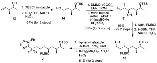 The synthesis of C16–C23 segment 4 was carried out, as shown in Scheme 2. Asymmetric crotylboration of acetaldehyde using cis-2-butene and (+)-B-methoxy-diisopinocamphenylborane using the protocol developed by Brown and co-workers [33,34] furnished optically active syn-alcohol 12. As reported previously [19], alcohol functionality was protected as a TBS-ether and hydroboration-oxidation of the alkene under standard condition afforded alcohol 16 in good yield. Swern oxidation of 16 provided the aldehyde, which was subjected to Brown’s asymmetric crotylboration using (−)-B-methoxy-diisopinocamphenylborane and trans-2-butene to afford alcohol 17 in good yield and with excellent diastereoselectivity (10:1). Alcohol 17 was protected as a PMB-ether and hydroboration-oxidation of the olefin furnished alcohol 18. Syntheses of derivatives of 17 and 18 with different protecting groups have been reported [17]. This was converted to sulfone 4 by the Mitsunobu reaction, followed by oxidation of the sulfide to sulfone.