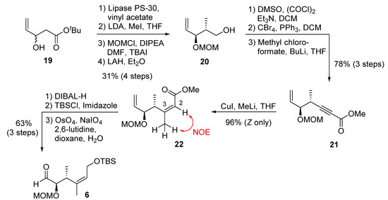 The synthesis of C1–C6 fragment 6 is shown in Scheme 3. The racemic alcohol 19, obtained from the aldol reaction of tert-butylacetate and acrolein, was subjected to immobilized lipase PS-30 catalyzed kinetic resolution in pentane in the presence of excess vinyl acetate, at 30 °C for 19 h, to provide enantio-enriched (R)-19 in 98% ee, along with the corresponding enantiomeric acetate derivative [35]. Treatment of (R)-19 with lithium diisopropylamide, followed by the reaction of the resulting dianion with methyl iodide as described by previously [36], afforded the corresponding anti-alcohol as a single isomer by 1H NMR analysis. The resulting alcohol was protected as a MOM-ether. Reduction of the resulting ester with LAH furnished alcohol 20. Synthesis of derivative of 20 with different protecting groups was reported [17]. Swern oxidation, followed by Corey–Fuchs’ homologation [37] of the aldehyde, provided the corresponding dibromo olefin. Treatment of the dibromide with butyllithium, followed by reaction of the resulting alkynyl anion with methyl chloroformate, furnished alkynyl ester 21 in excellent yield. A carbocupration of alkynyl ester 21 was carried out with freshly prepared Gilman reagent [38] at −40 °C to provide Z-olefin 22 as a single product in excellent isolated yield. The observed NOE between the protons at C2 and Me at C3 is consistent with the assigned Z geometry in ester 22. DIBAL-H reduction of 22, followed by protection of the resulting alcohol with TBSCl, furnished the corresponding silyl ether. Selective oxidative cleavage of the terminal olefin provided the C1–C6 fragment 6.
