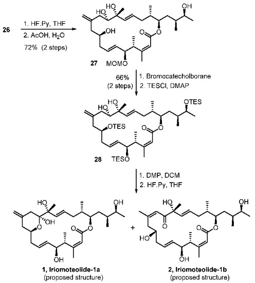With sulfone 5 and aldehyde 6 in hand, total syntheses of the proposed structures of iriomoteolide-1a and 1b were successfully achieved. The synthesis featured two successive Julia–Kocienski olefinations. As shown in Scheme 4, the first Julia–Kocienski reaction between sulfone 5 and aldehyde 6 afforded trans-olefin 23 in excellent yield. Removal of the benzyl ether, followed by DMP oxidation [39,40] of the resulting alcohol, afforded aldehyde 3. A second Julia–Kocienski reaction of aldehyde 3 and sulfone 4 furnished E-olefin 24 as the only isolated product in good yield. Removal of PMB ether, followed by selective removal of the primary TBS-ether with NH4F, resulted in allylic alcohol 25. Oxidation of 25 with MnO2 followed by NaClO2 afforded the corresponding carboxylic acid [41]. Yamaguchi macrolactonization furnished macrolactone 26 in good yield. Macrolactone 26 was converted to the proposed structures of irimoteolide-1a and irimoteolide-1b, as shown in Scheme 5. Treatment of 26 with HF•Py followed by aqueous AcOH resulted in tetraol derivative 27. Bromocatecholborane promoted the removal of the MOM group and furnished the corresponding pentaol derivative. Treatment of the free alcohols with TESCl and DMAP selectively provided TES- ether derivative 28 in good yield. DMP oxidation [39,40] of the secondary alcohol provided the corresponding ketone and removal of the TES groups with exposure to HF•Py furnished iriomoteolide-1a (1) in 56% yield and iriomoteolide-1b (2) in 17% yield after silica gel chromatography. The 1H-NMR and 13C-NMR of synthetic iriomoteolide-1a and iriomoteolide-1b did not match with the reported data for these natural products [7,8].