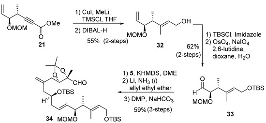 The synthesis of diastereomer 29 requires alteration of olefin geometry at C2–C3. As shown in Scheme 6, a carbocupration of alkynyl ester 21 with Gilman reagent at 0 °C in the presence of TMSCl resulted in the desired E-olefin as a major isomer (E:Z = 7:3) [38]. DIBAL-H reduction furnished the alcohol 32, which was separated from its Z-isomer by flash column chromatography over silica gel. Protection of alcohol with tert-butyldimethylsilyl chloride and oxidative cleavage of the terminal olefin provided the C1–C6 fragment aldehyde 33 for diastereomer 29. Treatment of sulfone 5 with slightly less than one equivalent of KHMDS, followed by exposure to aldehyde 33, afforded the E-olefin. However, we found that the use of more than one equivalent base led to the epimerization of the chiral center on C5. Removal of the benzyl group followed by Dess–Martin oxidation [39,40] provided the C1–C15 fragment, aldehyde 34.