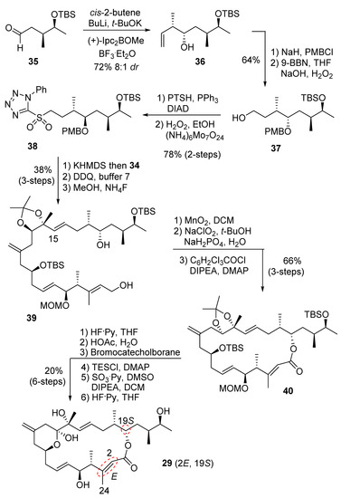 The synthesis of diastereomer 29 is shown in Scheme 7. Brown asymmetric crotyllation, by utilizing (+)-B-methoxydiisopino-campheylborane and cis-2-butene with aldehyde 35 derived from 16, provided syn-alcohol 36 in good diastereoselectivity (8:1 dr). PMB protection and hydroboration-oxidation provided alcohol 37. Alcohol 37 was converted to sulfone 38, as described previously. A Julia–Kocienski olefination [24,25] between aldehyde 34 and sulfone 38 using KHMDS in 1,2-dimethoxyethane furnished (15E)-olefin in good selectivity (E:Z = 9:1). The use of THF as a solvent caused an increase in Z-olefin by-product (E:Z = 4:1). Removal of the PMB ether and primary TBS ether led to diol 39. MnO2 oxidation and Pinnick oxidation [41] gave the corresponding seco-acid. Yamaguchi esterification furnished the macrolactone 40. A protecting group exchange protocol [26] afforded the corresponding vicinal diol. A one-pot reaction with the addition of HF•Py and Parikh–Doering oxidation led to isomer 29 exclusively, without isomerization of the exomethylene group at C11.