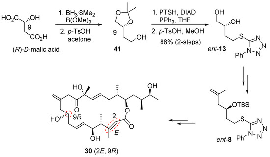The synthesis of diastereomer 30 requires alteration of the stereochemistry at C9. Our synthesis started with commercially available (R)-D-malic acid. As shown in Scheme 8, reduction of malic acid with the borane dimethylsulfide complex furnished the corresponding triol. Selective protection of the diol with acetone and p-TsOH furnished the alcohol 41 with desired chirality at C9. Using the previous synthetic route, enantiomeric sulfone ent-8 was obtained. Sulfone ent-8 was then converted to the corresponding macrolactone, as described previously. Protecting the group exchange protocol and oxidation, followed by the removal of the TES group as described previously, provided diastereomeric structure 30, where the hydroxyl ketone stays as a δ-hydroxyl-ketone instead of cyclic hemiketal, as revealed from the analysis of its 1H NMR and 13C NMR spectral data.