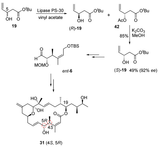Our synthesis of this diastereomeric structure of iriomoteolide-1a required altering the configurations at the C4 and C5 chiral centers. Therefore, the enantiomeric C1–C5 segment aldehyde, ent-6, was synthesized as shown in Scheme 9. Our enzymatic resolution of racemic alcohol 19 provided nearly a 1:1 mixture of (R)-19 alcohol and its acetate derivative 42 in excellent yield. Saponification of acetate by treatment of K2CO3 in MeOH at −30 °C provided (S)-19 alcohol in 92% ee. Seebach–Fráter alkylation [36] of (S)-19 with methyl iodide, as described in Scheme 3, furnished the corresponding anti-alcohol. Protection of alcohol as an MOM ether, followed by the reduction of the ester using LAH, afforded ent-20 alcohol. This was then converted to C1–C6 segment aldehyde ent-6. Aldehyde ent-6 was then exposed to Julia–Kocienski olefination with sulfone 5 to provide the corresponding trans-olefin, which was converted to the corresponding diastereomeric aldehyde, as described in Scheme 4. A second Julia–Kocienski olefination [24,25] with sulfone 4 provided the carbon framework for diastereomer 31. This was converted to the macrolactone, followed by the final target diastereomer 31 by following the steps described in Scheme 5.