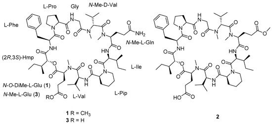 - Sivanathan, S.; Scherkenbeck, J. Cyclodepsipeptides: A rich source of biologically active compounds for drug research. Molecules 2014, 19, 12368–12420. [Google Scholar] [CrossRef]