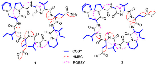 Compound 1 was purified as a white powder. The molecular formula of 1 was assigned to be C58H90N10O14 on the basis of a protonated ion peak at m/z 1151.6706 [M + H]+ (calcd for C58H91N10O14, 1151.6711) in the HRESIMS spectrum, in association with the 13C NMR data, requiring 19 indices of hydrogen deficiency. From the 1H and 13C NMR spectra, the presence of six exchangeable protons (δH 9.23, 8.57, 8.29, 8.06, 7.65, and 6.74), a series of α protons resonances at δH 4.37–5.63, four N/O-methyls (δH 3.00, 3.19, 3.52, and 3.62), and 12 carbonyl carbon signals (δC 169.1, 169.6, 170.0, 170.7, 171.1, 171.2, 171.4, 171.4, 172.8, 173.2, 173.3, and 174.8) indicated that 1 was a peptide structure. The NMR spectroscopic data of 1 were similar to those of the co-isolated cyclodepsipeptide Sch 217048 (3) [19], indicating that they were structurally related derivatives except for an additional methoxy signals (δH 3.62, δC 51.5) in 1. Interpretation of 2D (HSQC, COSY, and HMBC spectra) NMR data of 1 determined the presence of nine proteinogenic amino acids: phenylalanine (Phe), proline (Pro), glycine (Gly), N-methylvaline (N-Me Val), N-methylglutamine (N-Me Gln), isoleucine (Ile), pipecolic acid (Pip), valine (Val), and N-O-dimethylglutamic acid (N-O-DiMe Glu). In addition, the 2-hydroxy-3-methylpentanoic acid (Hmp) unit was elucidated by the COSY cross-peaks of H-2 (δH 5.52)/H-3 (δH 2.31)/3-Me (δH 0.88)/H-3/H2-4 (δH 1.15)/H3-5 (δH 0.70), as well as the HMBC interaction from H-2 to C-1 (δC 169.1). Comparison of the amino acid residues between 1 and 3 discovered that the sole difference was the presence of N-O-DiMe Glu in 1 instead of N-Me Glu in 3, as evidenced by the COSY correlations of Hmp from H2-3 (δH 2.85, 2.68) to H-2 (δH 4.37) and H2-4 (δH 2.70) as well as the HMBC cross-peaks from H2-3 to C-5 (δC 173.2) and from the additional methoxy protons (δH 3.62) to C-5 (Figure 2). The assembly sequence of nine amino acids and Hmp was corroborated to be the same as 3 according to the HMBC and ROESY correlations (Figure 2). The HMBC correlation from NH (δH 8.06) of Phe to the ester carbonyl carbon (δC 169.1) of Hmp, as well as the ROESY cross-peaks from H-2 (δH 5.34) of Phe to H2-5 (δH 3.87) of Pro, from NH (δH 8.57) of Gly to H-2 (δH 4.89) of Pro, and from N-Me (δH 3.19) of N-Me Val to H2-2b (δH 4.77) of Gly/H-3 (δH 2.52) of N-Me Val revealed the following sequence: Hmp-Phe-Pro-Gly-N-Me Val. According to the HMBC correlations from N-Me (δH 3.00) of N-Me Gln to carbonyl carbon (δC 170.7) of N-Me Val and from NH (δH 6.74) of Ile to carbonyl carbon (δC 169.6) of N-Me Gln further extended the sequence to be N-Me Val-N-Me Gln-Ile. Furthermore, the additional ROESY correlations (Figure S15) from H-2 (δH 5.22) of Ile to H2-6 (δH 3.77) of Pip, from NH (δH 9.23) of Val to H-2 (δH 5.54) of Pip, from N-Me (δH 3.52) of N-O-DiMe Glu to H-2 (δH 4.94) of Val established the Ile-Pip-Val-N-O-DiMe Glu sequence fragment. Finally, the ester linkage between Hmp and N-O-DiMe Glu was determined by the HMBC correlation from H-2 of Hmp to carbonyl carbon (C-1, δC 170.0) of N-O-DiMe Glu to construct a cyclodecadepsipeptide type structure.