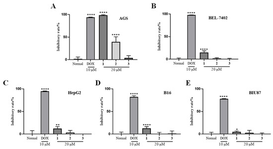 Cytotoxicity of compounds 1–3 against cancer cell lines of AGS (A), BEL-7402 (B), HepG2 (C), B16 (D), and BIU87 (E). * p < 0.05, ** p < 0.01, **** p < 0.0001 vs. Normal.