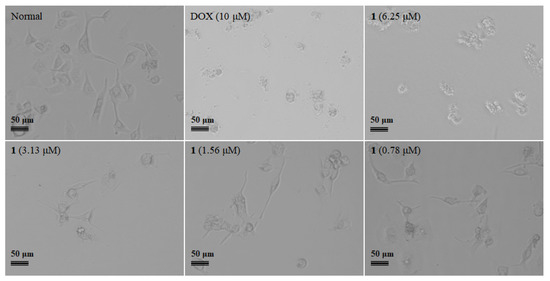 Cells were seeded into a 96-well plate at 5 × 103 cells per well and cultured overnight. Then, 1–3 were added at designated concentrations (n = 6) and cultured for 72 h. Doxorubicin (DOX; MCE, Monmouth Junction, NJ, USA) was used as the positive control. DMSO was used as vehicle control. The digital images of the cells were taken with a Nikon E80i microscope (Nikon, Tokyo, Japan). After that, the original cultured medium was removed, and a 100 μL new medium with 10% Cell Counting Kit-8 (CCK8; MCE) was added to each well and cultured for 2 h. The absorbance at 450 nm was detected with a microplate reader (Tecan Sunrise, TECAN Deutschland GmbH, Crailsheim, Germany), and the inhibitory rate was calculated according to the manufacturer’s instructions. The IC50 value was calculated with Prism 8 software (Graphpad, San Diego, CA, USA) from the nonlinear regression of the percentage of inhibition versus the log10 inhibitor concentration.