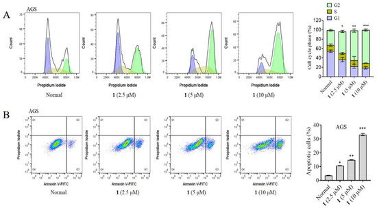 (A) Compound 1 induces cell cycle arrest of AGS cells at G2 phase. (B) Compound 1 induces apoptosis of AGS cells. Cells were treated with 1 at the concentration range from 0 to 10 μM for 24 h. * p < 0.05, ** p < 0.01, *** p < 0.001 vs. Normal.