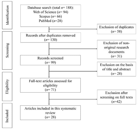 A total of 188 articles were retrieved from three different databases. Most of the articles were in the Web of Science database (n = 94), followed by the Scopus database (n = 66) and PubMed database (n = 28) (Figure 1). After removing the duplicates, 130 articles were obtained. Next, these articles were screened for nonoriginal documents. The remaining articles (n = 99) were reviewed based on titles and abstracts to ensure they were related to the topic. After the screening, potentially eligible studies (n = 71) were retrieved in full text. They were assessed further for eligibility based on the defined criteria: (1) inclusion of studies, specifically fucoxanthin production of microalgae involving fucoxanthin content or both growth (biomass concentration) and fucoxanthin content under different culture conditions, and the (2) exclusion of studies involving environmental studies (studies utilised fucoxanthin to analyse the microalgae community in a particular habitat). Finally, 28 articles were included in the present systematic review [4,5,12,13,14,15,16,17,18,19,20,21,22,23,24,25,26,27,28,29,30,31,32,33,34,35,36,37]. The information from these articles was extracted and is summarised in Table 1.