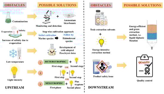 Microalgae appeared to be a promising source of fucoxanthin. Hence, a large number of research and development programs have been conducted worldwide. However, commercial production of microalgal-based fucoxanthin is far from economically feasible. Numerous obstacles hinder the fucoxanthin production of microalgae (Figure 2). One of them is biological contamination. Different types of biological contaminants could inhibit or devastate the cellular biomass accumulation of the microalgae. At the same time, they also decreased the growth of microalgae indirectly, resulting in a reduction of fucoxanthin productivity. These contaminants are fungi, bacteria, protozoa, rotifer, viruses or undesired alga [58]. For instance, contamination with fungi under the class Oomycota could lead to a loss of 10–60% marine microalgae culture [59]. In addition, contamination elevated the cost of microalgal cultivation and resulted in economically infeasible. Biological contamination of Spirulina platensis culture by rotifers led to a loss of USD 1230 worth of dry biomass [60]. To date, only one study reported the effect of biological contaminants, protozoa, on the growth and fucoxanthin content of P. tricornutum [61]. Heterolobosean amoeba was the most destructive protozoan, which can engulf up to 60 P. tricornutum cells within 10 min. After being contaminated with this protozoan, a total reduction of 84.62% and 96.80% in biomass productivity and fucoxanthin content of P. tricornutum were reported. To overcome the contamination problems, culture monitoring and detection of contaminants are indispensable in the early stage of this issue. Conventional morphological observation approaches such as staining and microscopy are employed to detect and identify the contaminant. After knowing the contaminant, a reliable strategy could be developed to control and even prevent the transmission of contaminants [62]. For example, periodic culture mixing with the usage of ammonium bicarbonate alleviated the damage caused by the amoeba by creating an unfavourable condition for the amoeba and subsequently increased the microalgal biomass concentration [61].