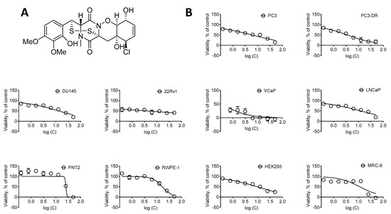 Remarkably, halogenated analogs of glioverin were reported to be more bioactive in comparison to nonhalogenated molecules [13,14]. N-methylpretrichodermamide B (NB) is a glioverin derivative containing chlorine and a disulfide bridge in its structure (Figure 1A). Initially, this natural compound was isolated from the fungus Penicillium sp. found in an Egyptian hypersaline lake [8]. Simultaneously, NB was isolated from a sponge-derived Penicillium adametzioides strain by the group of Huang and Wang, who described it as a new adametizine A [11]. More recently, NB was reisolated by us from an ethyl acetate extract of the algae-derived fungus Penicillium sp. KMM 4672 [9]. In comparison with nonchlorinated analogs, NB exhibited more pronounced activity against Artemia salina (LD50 4.8 µM) and antimicrobial activity in various pathogenic bacteria (MIC 8–32 µm/mL) [11]. Notably, in this study, no significant anticancer activity in a panel of 14 human cancer cell lines, including human lung, cervical, liver, breast, gastric, pancreatic, colon, and glioma cancer cells, and one prostate cancer cell line DU145, was reported (IC50 > 10 µM) [11]. Furthermore, the other group reported a significant cytotoxicity against mouse lymphoma cells L5178Y with IC50 = 2 µM [8]. Moreover, recently, we also described a pronounced cytotoxic activity of this marine natural compound in human prostate cancer 22Rv1, PC-3, and LNCaP cells with IC50 = 0.51, 5.11, and 1.76 µM, respectively [9]. Interestingly, NB was found to be active in hormone-independent (and therefore, drug-resistant) 22Rv1 cells at submicromolar concentrations, while no hemolytic activity (IC50 ≥ 100 µM) and only minor cytotoxic activity in splenocytes (ID50 = 62.1 µM) was observed [9]. Despite the promising activity, no data on the mechanism of action in mammalian cells are available to date.