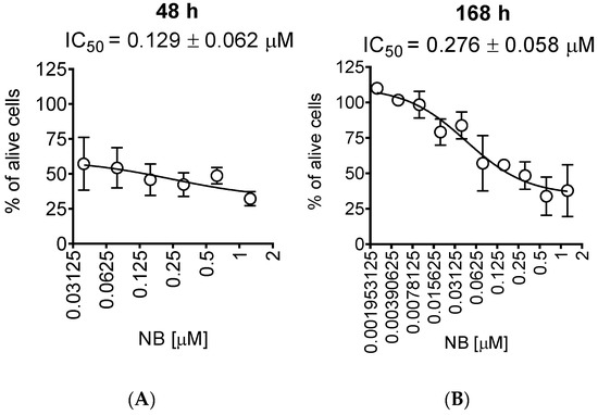 For further investigations, we selected human prostate cancer 22Rv1 cells, since they displayed one of the highest sensitivities to NB. Moreover, 22Rv1 cells are known to express not only AR-FL but also AR-V7: an AR splice variant responsible for resistance to AR-targeted therapy. Thus, these cells represent an aggressive hormone-independent prostate cancer subgroup. The MTT assay assesses the metabolic activity of the cells [20] by determining the mitochondrial reducing capability. Trypan blue exclusion assay, on the other hand, differentiates between the cells with intact (trypan blue negative alive cells) or disrupted (trypan blue positive dead cells) cellular membrane and is usually used for the assessment of cellular proliferation [21]. Interestingly, the cytotoxic effect of NB determined by trypan blue exclusion assay was more pronounced than the effect determined using MTT assay (Figure 2, Table 1). In both MTT and trypan blue exclusion assays, a statistically significant suppression of cellular viability was already observed at concentrations much lower than IC50s (Figure 1B and Figure 2A). Therefore, we speculated that a longer treatment time may result in a further IC50 decrease and, consequently, we assessed the cytotoxic activity of NB after 7 days of treatment (Figure 2B). However, the activities determined 48 h and 168 h following the treatment were comparable (Figure 2A,B). This finding suggests that 48 h is an optimal time for the investigation of the anticancer effects of NB.