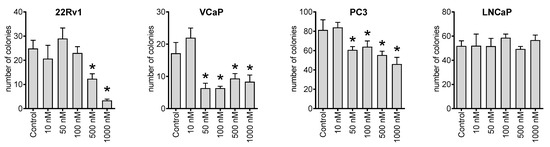 Next, we investigated the effect of NB on the ability of cancer cells to form colonies from single cells using a colony formation assay and a preplating mode. Thus, we observed that the compound could inhibit the colony-formation ability of 22Rv1, VCaP, and PC3 cell lines at nanomolar concentrations (Figure 3). This suggests a possible antimetastatic activity reflecting a suppression of metastases formation from single cancer cells. However, this speculation awaits further confirmation in vivo.