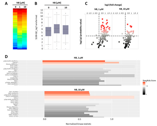 Kinome profiling of serine/threonine kinases (STKs). 22Rv1 cells were incubated with NB for 2 h; the proteins were extracted and STK were analyzed using functional kinome profiling. The heatmap displays the log2-transformed signal intensities for each sample. The signals were sorted from high (red) to low (blue) intensity/phosphorylation (A). The overall peptide phosphorylation and, with that, the overall kinase activity is shown by the box plot (B). The volcano-plot identifies significantly altered peptides. Red dots indicate significantly increased phosphorylation of peptide substrates compared to control samples (log2(p) > 1.3, dotted line (C). (D) Upstream kinase analysis indicating effect of the treatment on STK in 22Rv1. The top kinases predicted to be affected are shown, with all kinases displaying normalized kinase statistic > 0 (X-axis), meaning higher activity of these kinases in cells treated with NB in comparison to control; specificity score > 1.3 indicates statistically significant changes. Number of replicates n = 3.