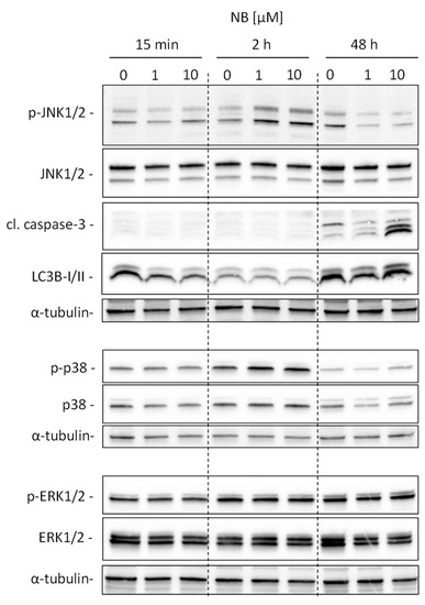 Our analysis suggests kinases JNK1 and p38delta to be the most likely activated in NB-treated prostate cancer cells (Figure 5D). To validate and further classify these results, we performed Western blotting analyses of JNK1/2 and p38 MAPK activation. We examined several time points, specifically, 15 min, 2 h, and 48 h (Figure 6). A pronounced JNK1/2 phosphorylation and activation of p38 were detected after 2 h of treatment with NB, while no activation of other MAPK ERK1/2 (which was not predicted to be significantly affected under the treatment) was detected (Figure 6). Of note, no phosphorylation (or even slight downregulation) of JNK1/2 was found after 48 h of exposition to NB (Figure 6). The latter effect may be a result of cell death-related events, which was suggested by the caspase-3 cleavage that was observed 48 h after drug exposure. Notably, no significant effect on autophagy was detected as suggested by the lack of alteration of LC3B-I/II expression in the treated cells (Figure 6). Hence, our results indicate JNK1/2 and p38 phosphorylation to be one of the first drug-induced cellular events when exposed to NB (2 h time point, Figure 6), before any signs of cytotoxicity can be detected (48 h time point, Figure 6).