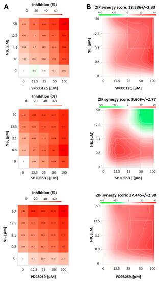 Whether activation of MAPKs contribute to cell death or survival depends not only on the cellular context, but also on the nature of the activating stimuli [37]. Thus, to reveal the function of JNK1/2 and p38 in the anticancer effect of NB, we co-treated 22Rv1 cells with NB and specific inhibitors of the above-mentioned MAPKs. Therefore, selective JNK1/2 inhibitor SP600125, p38 inhibitor SB203580, and MEK1 inhibitor PD98039 (Figure 7) were used. As MEK1/2 kinase directly and exclusively activates ERK1/2, PD98039 inhibitor is often used as an ERK1/2 inhibitor [38]. Thus, an inactivation of MEK1/2 leads solely to an inhibition of ERK1/2 [38]. Since the inhibitors themselves exert cytotoxic effects in cancer cells, we used a Chou–Talalay method to distinguish between synergism, additive effects, or antagonistic effects of the particular MAPK inhibitor on the compound bioactivity. For this, using an MTT assay, we determined a cytotoxic effect on various concentrations of NB, MAPK inhibitors, and their combinations in 22Rv1 cells. The viability data were further analyzed using the SynergyFinder v. 2.0 software (Network Pharmacology for Precision Medicine in the Research Program of System Oncology, Faculty of Medicine at University of Helsinki, Helsinki, Finland) and a Zero interaction potency (ZIP) reference model [39] (Figure 7). Hence, the heatmaps displaying the percentage of dead cells in each treatment setting were generated (Figure 7A). Remarkably, our investigations suggest a pronounced synergism of NB in combination with JNK1/2-inhibitor SP600125 and p38-inhibitor SB203580, indicating the activation of both kinases in response to NB treatment is a prosurvival mechanism, which reduces NB cytotoxicity (Figure 7B). In addition, the MEK1/2-inhibitor PD98039 displayed a similar effect when combined with NB (Figure 7B). Thus, an active MEK/ERK pathway also seems to be important for cellular survival in this particular context and to help the cancer cells to overcome the cytotoxic effect of NB.