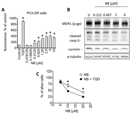 Effect of NB on p-gp expression and activity of PC3-DR cells. (A) Effect of NB on calcein accumulation (measures as green fluorescence) in PC3-DR cells. The effect was measures following 30 min incubation with the drug. P-gp inhibitor tariquidar (TQD, 50 nM) was used as a positive control. Number of replicates n = 3. (B) Western blotting analysis of protein expression in PC3-DR cells after 48 h of treatment with the indicated concentrations of NB. (C) Effect of NB on the viability of PC3-DR cells. Cells were treated with NB for 48 h with or without 30 min pretreatment with tariquidar (TQD, 50 nM) for 30 min. Viability was measured using an MTT assay. Number of replicates n = 3. Statistical significance: * p < 0.05 in ANOVA (A) or Student’s t-test (C).