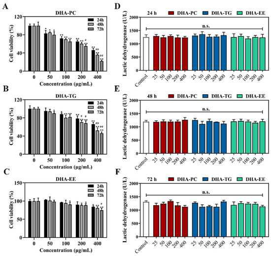 Effects of DHA with different molecular forms on the growth of 95D lung cancer cells. (A) Cell viability in DHA-PC group. (B) Cell viability in DHA-TG group. (C) Cell vi-ability in DHA-EE group. (D) LDH activity in 24 h. (E) LDH activity in 48 h. (F) LDH activity in 72 h. Data are presented as mean ± SD (n = 6). * p < 0.05, ** p < 0.01 versus control group. # p < 0.05, ## p < 0.01 versus 24 h. n.s., no significance. Abbreviations: lactic dehydrogenase (LDH).