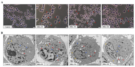 The morphological changes of the 95D cells were observed by hematoxylin staining and TEM. As shown in Figure 2A, different molecular forms of DHA (especially DHA-PC) treatment prompted severe morphological changes in 95D cells compared with the control group, including cell enlargement and rounding, blurred cell membrane borders, and intracellular vacuoles. Further, the sub-microstructural results showed that treatment with different molecular forms of DHA resulted in a concentration of cellular heterochromatin, severe vacuolization of the cytoplasm, and different degrees of edema in the endoplasmic reticulum and mitochondria (Figure 2B). Similarly, DHA-PC ameliorated microarchitectural degeneration more significantly than DHA-TG and DHA-EE. These results of morphological changes suggested that different molecular forms of DHA treatment may decrease the cell viability by inducing 95D cell apoptosis.