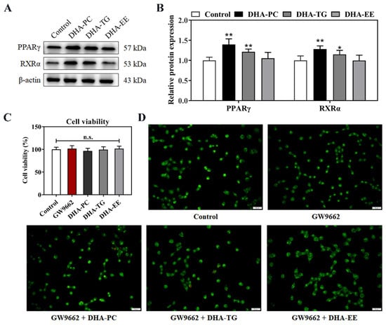 Effects of DHA with different molecular forms on the expression of PPARγ in 95D lung cancer cells (A) Western bolt analysis for PPARγ and RXRα protein expression. (B) Quantitative analysis of the PPARγ and RXRα protein expression levels. (C) Cell viability. (D) Acridine orange/ethidium bromide staining (magnification, ×400; scale bar, 20 μm; Green fluorescence: normal cells, orange fluorescence: apoptotic cells). Data are presented as mean ± SD (n = 6). * p < 0.05, ** p < 0.01 versus control group. n.s., no significance. Abbreviations: peroxisome-proliferation-activated receptor gamma (PPARγ), retinoid X receptor alpha (RXRα).
