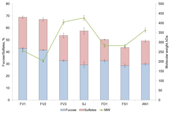 The yield of fucoidans varied between 6.6 and 22.3% of the seaweed dry weight (DW). The main components were neutral carbohydrates (44.5–65.9 g/100 g DW) and sulfate (15.1–28.1 g/100 g DW). Samples FD1 and FS1 contained a high ratio of neutral carbohydrates to sulfates. SJ showed a high neutral carbohydrate content (Table 1) but the lowest fucose content (Figure 1). The yield of the additionally purified from phenolic compounds sulfated polysaccharide (FV2) represented 6.6% of DW of seaweeds, and its proportion of sulfate from neutral carbohydrate (2.45) almost coincided with the proportion of FV1 (2.54). Minor components in all samples were polyphenols with an average of 70.6 mg/g DW (Table 1).