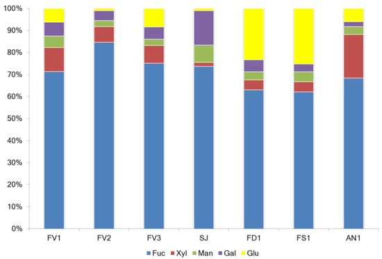Normalized histogram of monosaccharide composition of fucoidans extracted from the brown algae. F. vesiculosus (FV1, FV2, FV3), S. japonica (SJ), F. distichus (FD1), F. serratus (FS1), and A. nodosum (AN1). Fucose (Fuc), xylose (Xyl), mannose (Man), galactose (Gal), and glucose (Glu).
