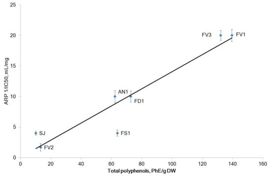 The IC50 represents the concentration of the tested sample or standard antioxidant required to scavenge 50% of the DPPH-radical. The antiradical power (ARP) was calculated as ARP = 1/IC50 [].