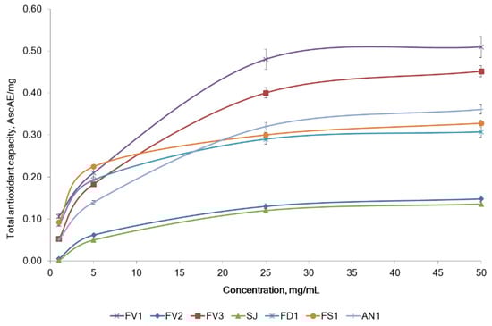 The analysis of TAC of fucoidans was based on the reduction of Mo(VI) to Mo(V) by the samples and the subsequent formation of a green phosphate/Mo(V) complex at acid pH. The TAC was quantitatively expressed in equivalents of ascorbic acid []. The tested fucoidans showed total antioxidant activity at different concentrations (1–50 mg/mL). The TAC of all fucoidan samples concentration-dependent increased up to 25 mg/mL, followed by a plateau up to 50 mg/mL (Figure 4). Fucoidans FV1 and FV3 from F. vesiculosus had a higher TAC than the other fucoidans. The maximum activity of 0.51 ± 0.03 mg AscAE/mg was observed for fucoidan FV1 at 50 mg/mL (Figure 5). The order of the TAC for all the tested seaweed fucoidans was FV1 > FV3 > AN1 > FS1 > FD1 > FV2 > SJ (Figure 5). Notable that the TAC of fucoidans except samples of FV2 and SJ (which have a lower polyphenolic content) was higher than that of phloroglucinol (Figure 5). In the TAC assay, the activities of fucoidans FV1 and FV3 extracted by different methods were equal.