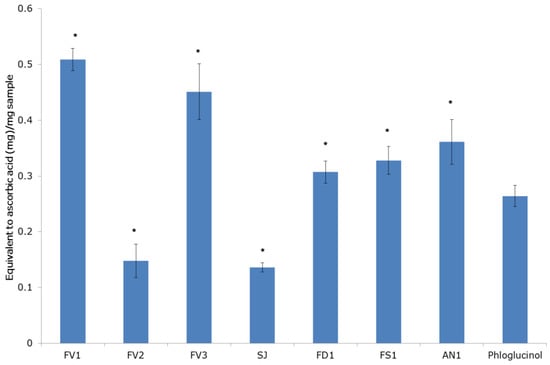 Total antioxidant capacity (TAC) of fucoidans at 50 mg/mL concentration, extracted from the brown seaweeds. F. vesiculosus (FV1, FV2, FV3), S. japonica (SJ), F. distichus (FD1), F. serratus (FS1), and A. nodosum (AN1). * A significant (p < 0.000) difference was found between the phloroglucinol group (reference drug) and fucoidan groups.