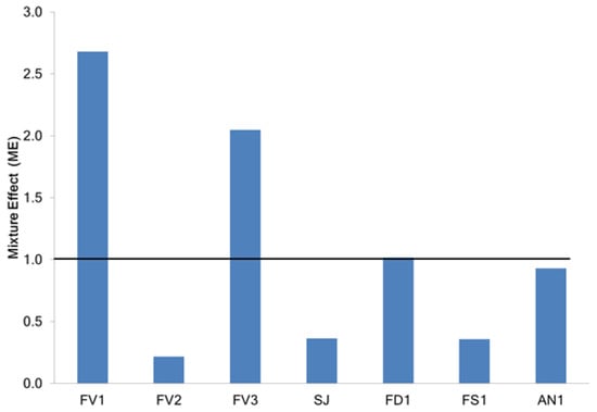 The mixture effect (ME) was calculated according to [] to Equation (2):