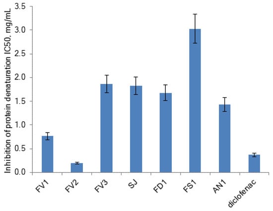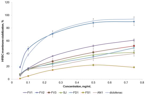 Various non-steroidal anti-inflammatory drugs (NSAID) have previously been shown to inhibit the denaturation of biologically active plasma proteins in vitro []. Denaturation affects nearly all physicochemical properties of protein molecules []. Protein denaturation may be the initial step in further protein modification, such as protein glycosylation. Phenomena of abnormal protein glycosylation often occur in chronic inflammatory diseases []. The implementation of the erythrocyte membrane stabilization model for anti-inflammatory screening is based on the structural similarity between erythrocyte membranes and lysosomes. Lysosomes are significant organelles that induce the mechanism of action in the late inflammatory response by releasing bactericidal enzymes and various proteases. Thus, maintaining their structural integrity is critical for suppressing the inflammatory process []. Due to the similarity of the lysosomal membrane to the erythrocyte membrane, the model of stabilization of human red blood corpuscles (HRBC) membrane has been used for the estimation of the anti-inflammatory activity of plant extracts. [].