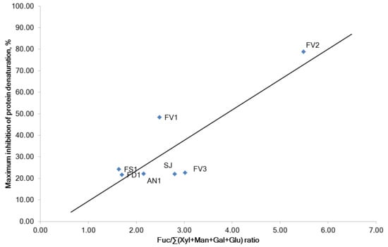 The protein (albumin) denaturation was concentration-dependently inhibited by fucoidans and diclofenac sodium at the concentration range of 0.05–0.75 mg/mL. A strong correlation was found between the anti-inflammatory effect (inhibition of protein denaturation) and the content of carbohydrates and molecular weight of fucoidan (Pearson’s correlation coefficients r = 0.848 and −0.744, respectively, p < 0.05). The correlation of inhibition of protein denaturation with the content of sulfates was moderate (Pearson’s correlation coefficient r = 0.478, p < 0.05). Surprisingly, purified fucoidan FV2 was significantly powerful inhibitor of proteins denaturation (IC50 = 0.20 mg/mL) than diclofenac sodium (IC50 = 0.37 mg/mL). It was noted that the inhibition of protein denaturation was increased with the increase in the relative fucose content in carbohydrates ((Fuc/Σ(Xyl + Man + Ga + Glu) ratio) (Figure 8). The correlation between the anti-inflammatory activity of fucoidans and TPC was extremely weak (Pearson’s correlation coefficients r = −0.211, p < 0.05).