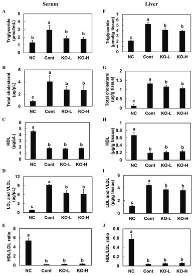 Change in lipid profiles of serum and liver from hypercholesterolemic rats fed a diet supplemented with krill oil. Levels of triglyceride (A), total cholesterol (B), HDL (C), LDL and VLDL (D), and HDL/LDL ratio (E) in the serum and triglyceride (F), total cholesterol (G), HDL (H), LDL and VLDL (I), and HDL/LDL ratio (J) in the liver. NC, normal AIN93G diet control group; Cont, high-cholesterol diet control group; KO–L, high-cholesterol diet with krill oil 100 mg/kg b.w.; KO–H, high-cholesterol diet with krill oil 200 mg/kg b.w. Values are presented as means ± SD. Different letters indicate a significant difference at p < 0.05, as determined by Duncan’s multiple range test.