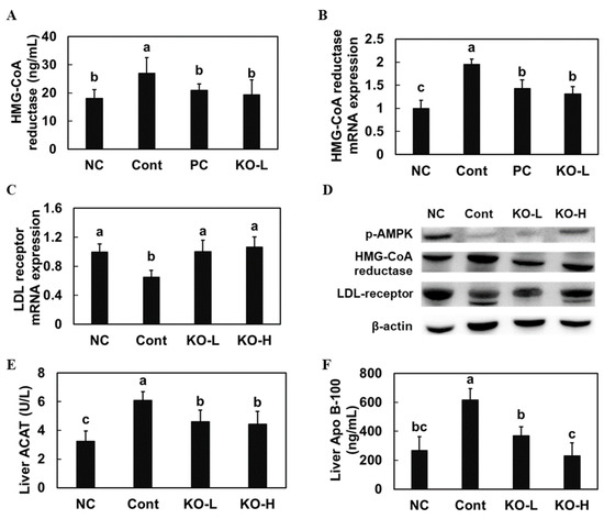 HMG-CoA reductase activity (A), HMG-CoA reductase mRNA expression (B), LDL mRNA expression (C), LDL protein expression (D), ACAT2 level (E), and Apo B-100 level (F), in the liver from hypercholesterolemic rats fed a diet supplemented with krill oil. NC, normal AIN93G diet control group; Cont, high-cholesterol-diet control group; KO–L, high-cholesterol diet with krill oil 100 mg/kg b.w.; KO–H, high-cholesterol diet with krill oil 200 mg/kg b.w. Values are presented as means ± SD. Different letters indicate a significant difference at p < 0.05, as determined by Duncan’s multiple range test.