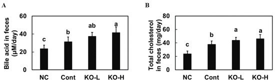 Level of bile acid (A) and total cholesterol (B) in feces from hypercholesterolemic rats fed a diet supplemented with krill oil. NC, normal AIN93G diet control group; Cont, high-cholesterol-diet control group; KO–L, high-cholesterol diet with krill oil 100 mg/kg b.w.; KO–H, high-cholesterol diet with krill oil 200 mg/kg b.w. Values are presented as means ± SD. Different letters indicate a significant difference at p < 0.05, as determined by Duncan’s multiple range test.