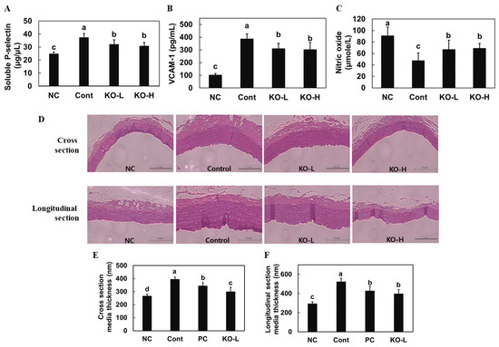 Levels of P-selectin (A), sVCAM-1(B), and nitric oxide (C) in serum and aortic wall thickness (D–F) in hypercholesterolemic rats fed a diet supplemented with krill oil. NC, normal AIN93G diet control group; Cont, high-cholesterol diet control group; KO–L, high-cholesterol diet with krill oil 100 mg/kg b.w; KO–H, high-cholesterol diet with krill oil 200 mg/kg b.w. Values are presented as means ± SD. Different letters indicate a significant difference at p < 0.05, as determined by Duncan’s multiple range test.