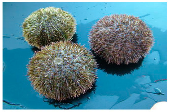 This species of sea urchins mainly lives on rocky areas of the bottom, but sometimes they live on a sandy surface and in thickets of seagrasses [8,9,10,11,12,13,14,15]. The body of this sea urchin has a regular spherical shape, slightly flattened from the side of the mouth opening. The diameter of an adult sexually mature individual is from 3 to 8 cm, and the mass reaches 160–170 g. The color of the needles and the shell of S. intermedius is very diverse—red, purple, green, gray, brown. At a young age, these sea urchins feed on films of microscopic algae, and the adults feed on brown algae [8,9,10,11,12,13,14,15,16].