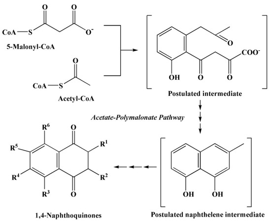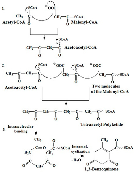The polyketide pathway of quinone biosynthesis is a process of gradual chain elongation, similar to the biosynthesis of fatty acids (Figure 4) [42]. At the first stage of biosynthesis, condensation of acetyl-CoA and malonyl-CoA occurs. In addition, the elongation of the carbon chain is increased by the addition of C2 fragments of malonyl-CoA until the desired chain length is reached. Malonyl-CoA serves as an activated donor of acetyl groups. Thus, a polypeptide system is formed due to CO and CH2 groups with the elimination of a water molecule and the formation of an aromatic or quinoid molecule [42,43].