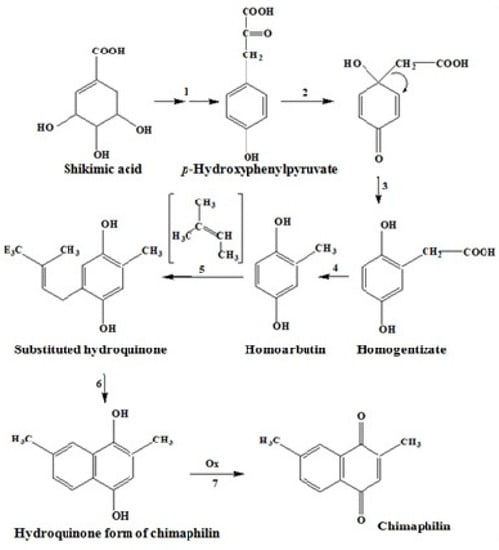 Substituted naphthoquinones and anthraquinones are formed from mevalonic acid and its derivatives by mevalonate biosynthesis [42,50]. A combination of two biosynthetic pathways (shikimate and mevalonate) is often used by plants (Pyroleae (Dumort, 1829)) to produce substituted naphthoquinones. The quinoid structure of 1,4-naphthoquinone – chimaphilin is derived from shikimate, and methyl substituents and benzoic acid atoms are derived from mevalonate (Figure 6) [42].